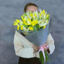 На фото букет из 33 желтых ирисов. В составе: ирис 33 шт, дизайнерская упаковка 2 шт, атласная лента 2 шт, . Все цветы свежие и ароматные, букет красиво оформлен и отлично подходит для подарка. Доступна доставка цветов или самовывоз.