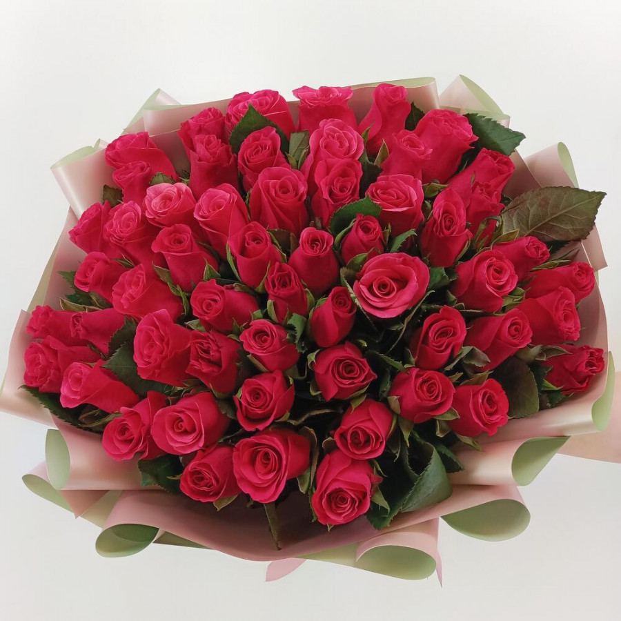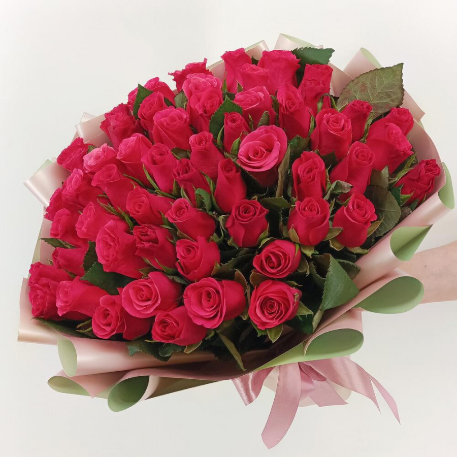 На фото букет из 51 малиновой розы. В составе: роза 51 шт, дизайнерская упаковка 1 шт, атласная лента 1 шт, . Все цветы свежие и ароматные, букет красиво оформлен и отлично подходит для подарка. Доступна доставка цветов или самовывоз.