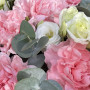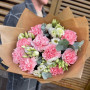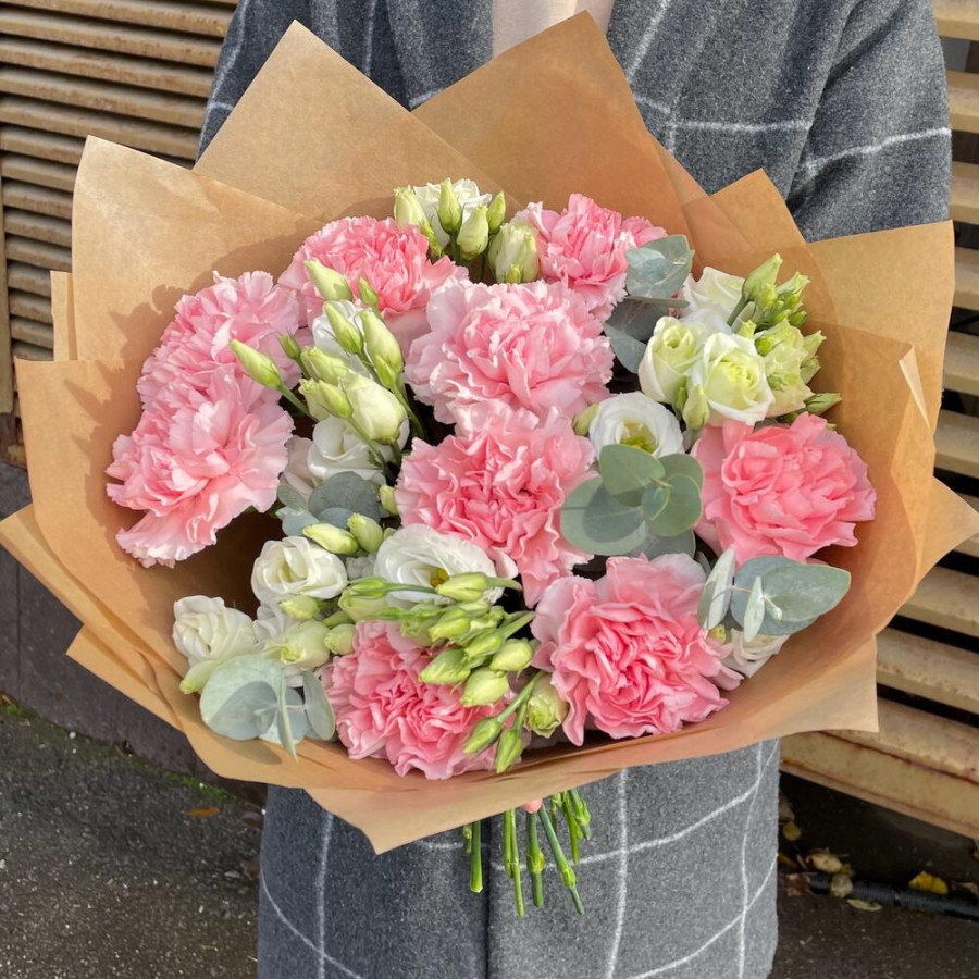 На фото букет из белой эустомы и розовых гвоздик. В составе: эустома (лизиантус) 4 шт, гвоздика 9 шт, эвкалипт 4 шт, крафт-бумага 1 шт, атласная лента 1 шт, . Все цветы свежие и ароматные, букет красиво оформлен и отлично подходит для подарка. Доступна доставка цветов или самовывоз.