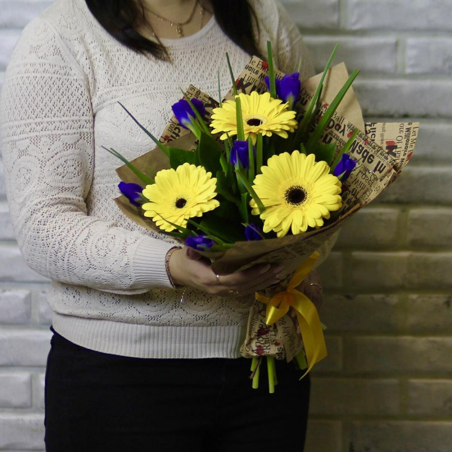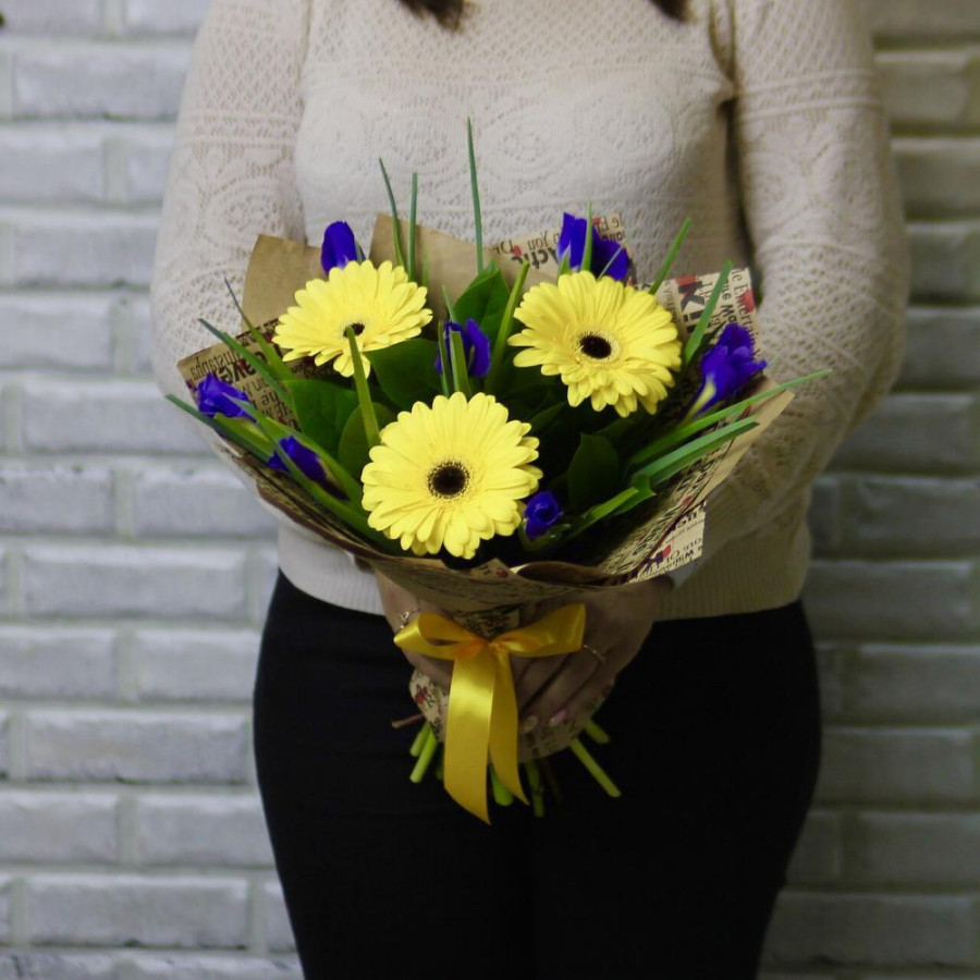 Букет из желтых гербер с синими ирисами в Солнечногорске