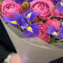 Букет из розовых пионовидных роз и синих ирисов в Солнечногорске