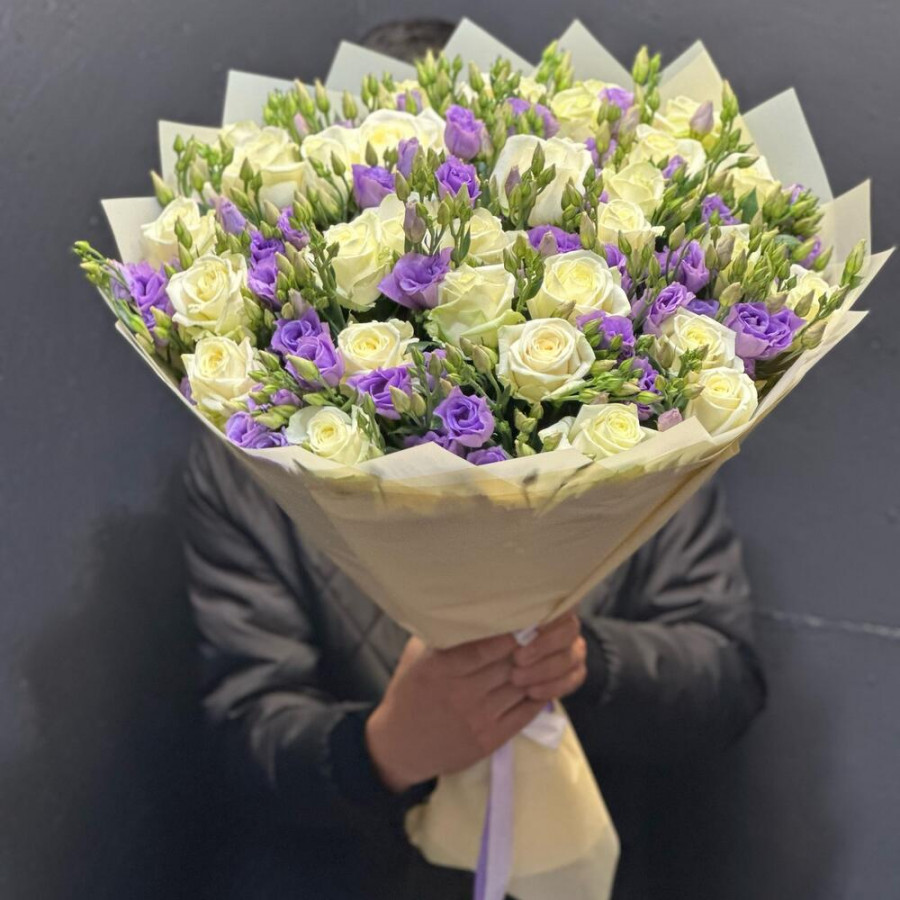На фото букет из сиреневых эустом и белых роз. В составе: эустома (лизиантус) 21 шт, роза 30 шт, дизайнерская упаковка 3 шт, атласная лента 2 шт, . Все цветы свежие и ароматные, букет красиво оформлен и отлично подходит для подарка. Доступна доставка цветов или самовывоз.
