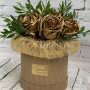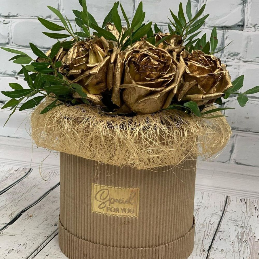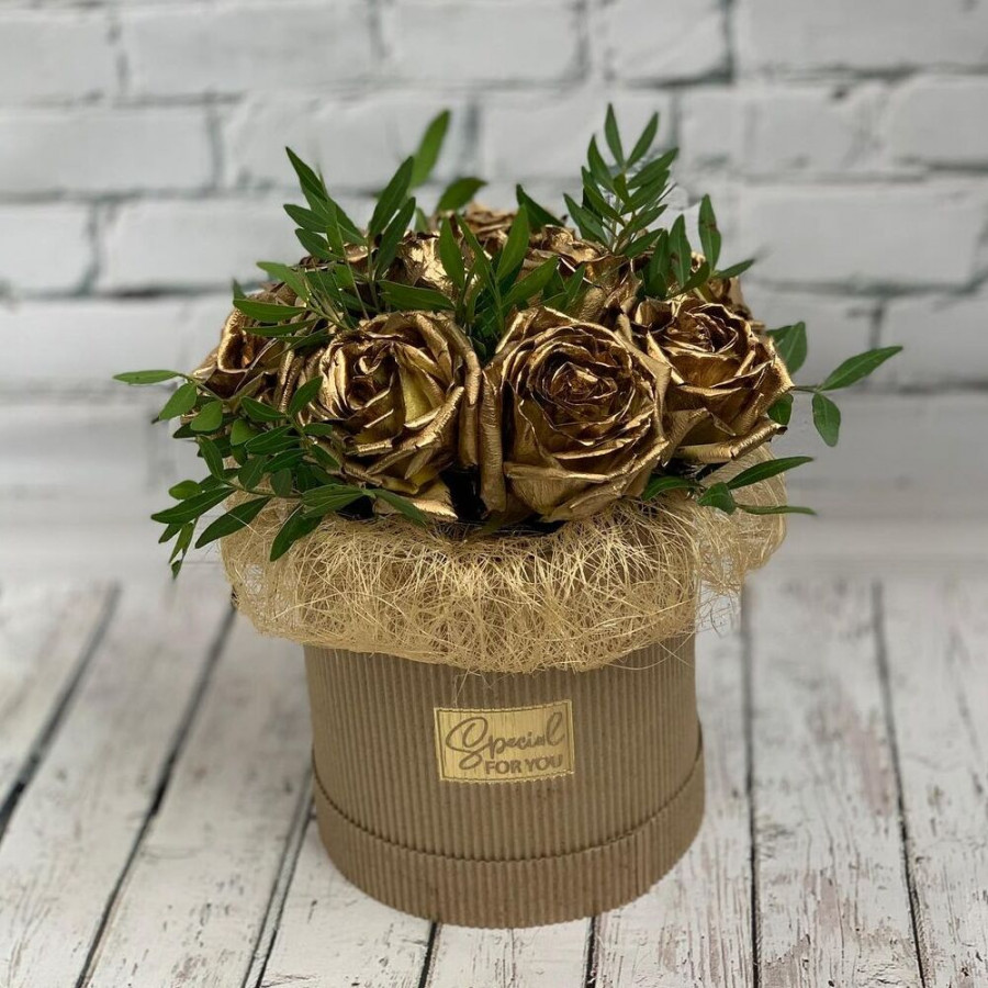 На фото букет из золотых роз. В составе: роза 9 шт, шляпная коробка (s) 1 шт, . Все цветы свежие и ароматные, букет красиво оформлен и отлично подходит для подарка. Доступна доставка цветов или самовывоз.