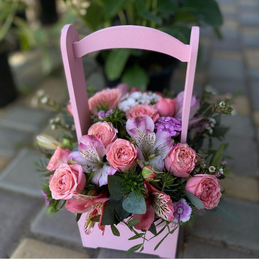 Пионовидные розы с альстромериями в деревянном ящике в Солнечногорске